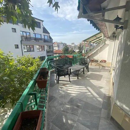 Представяйки гледки към градината, 56 кв.м. Централен Студио със Завидна Тераса и Безплатно Улично Паркиране в Пловдив се намира в центъра на Пловдив, където тълпите гледат събития в Древния театър на Филипопол, с изглед към хълмистия град, само на 7-минутно разстояние от центъра.